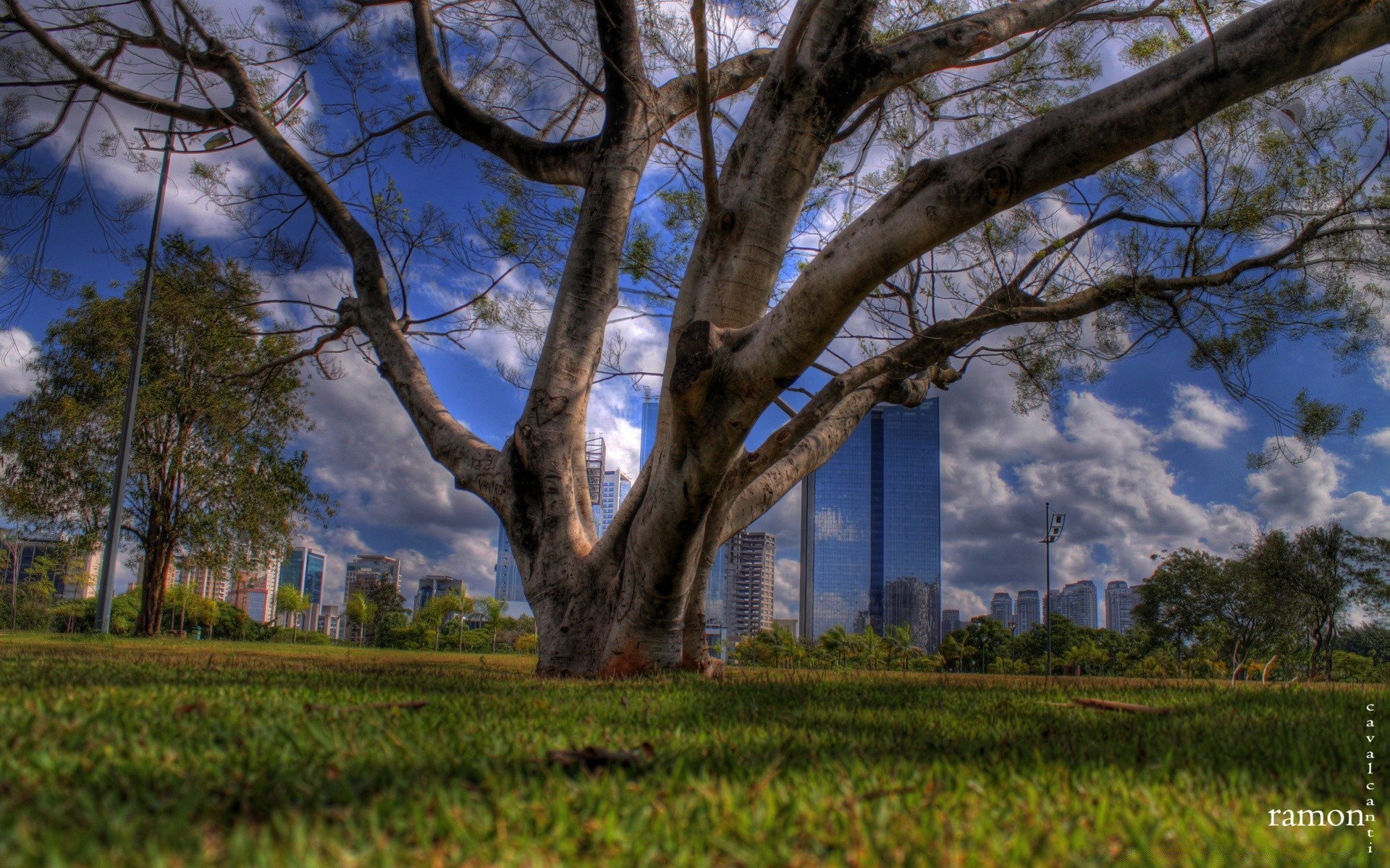 Gece parkı, mimari ve şehir ışıkları. ABD
