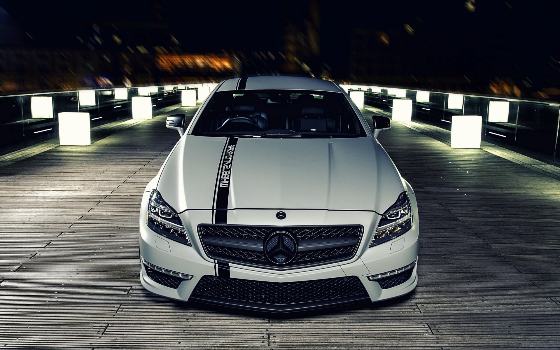 Ulaşım sisteminin gece ışıklarının fln'sinde beyaz spor Mercedes'i