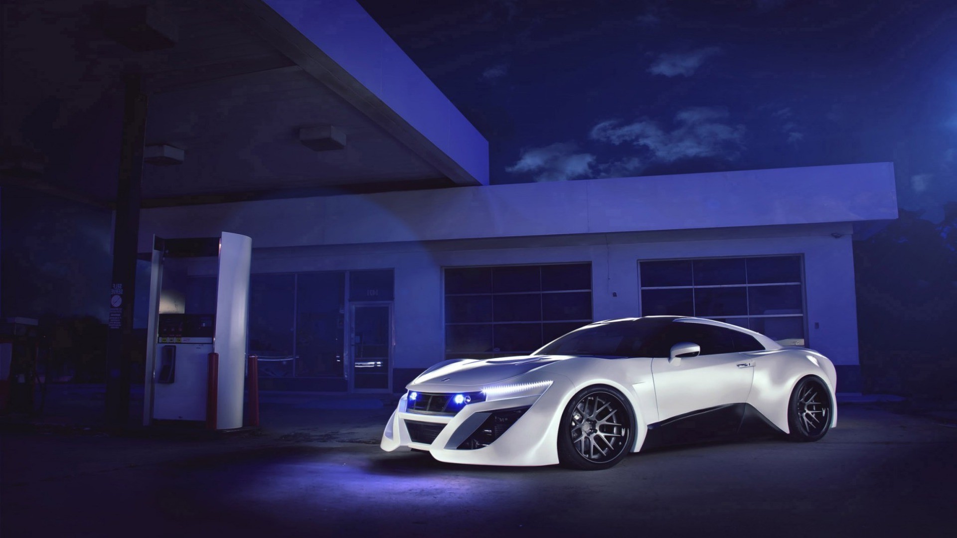Mor yakıt ikmalinin arka planına karşı beyaz spor arabası