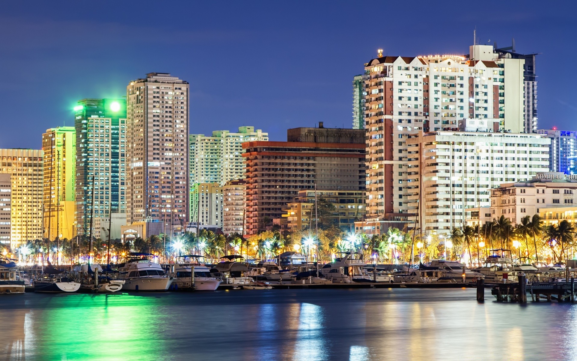 Su zemininde gece aydınlatması olan Asya tarzı bina