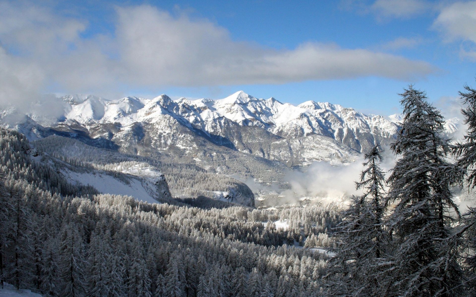 Güneş karla kaplı köknarların tepelerini aydınlatıyor