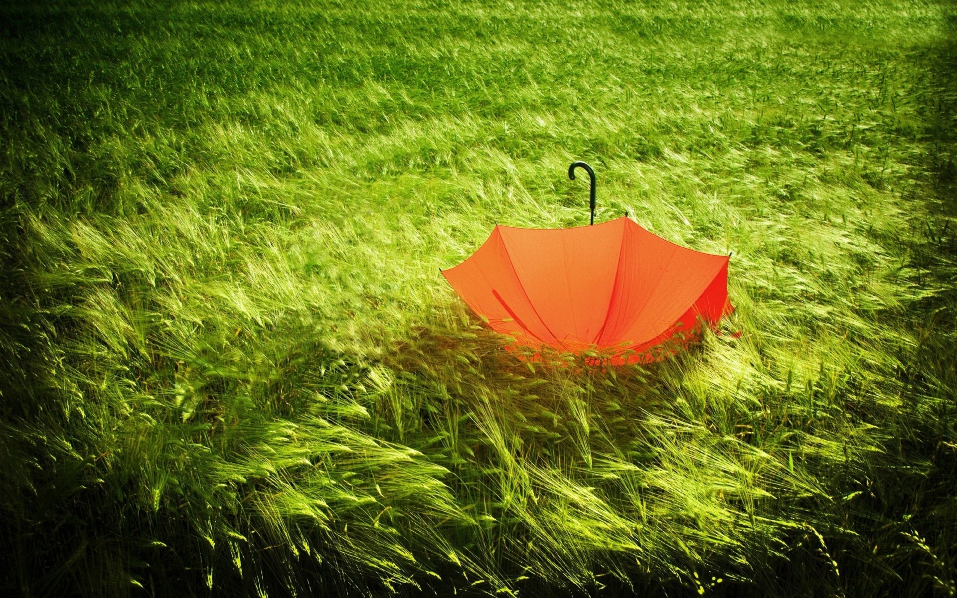 Turuncu şemsiye ormanda yeşil çimenlerin üzerinde yatıyor