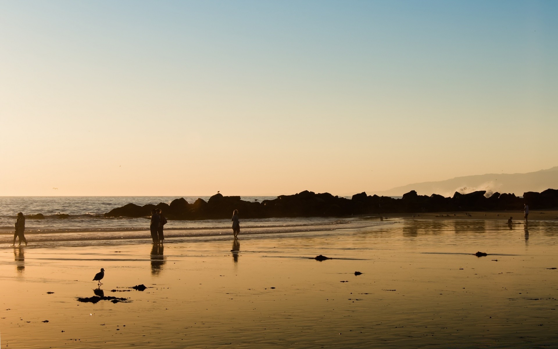 Gün batımının ışığı altında sahil şeridinde yürüyen insanlar şeffaf bir grono