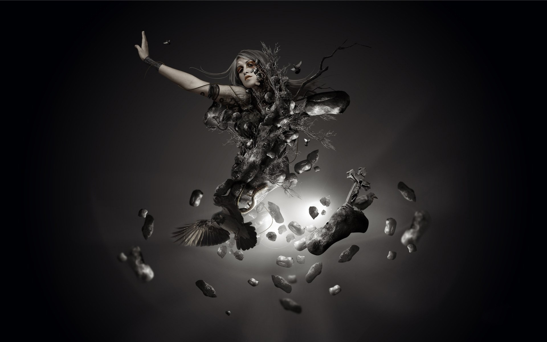 Kız ve kuş soyutlamasının karanlık illüstrasyonu