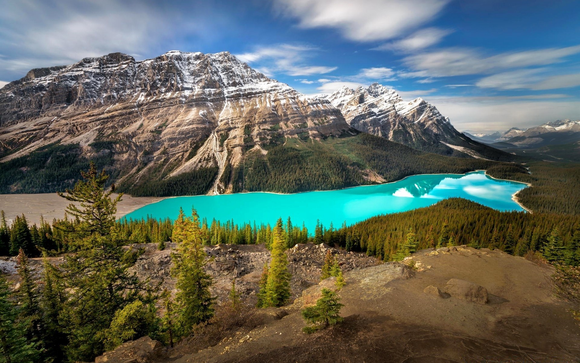 Karlı dağ zirveleri ve göl