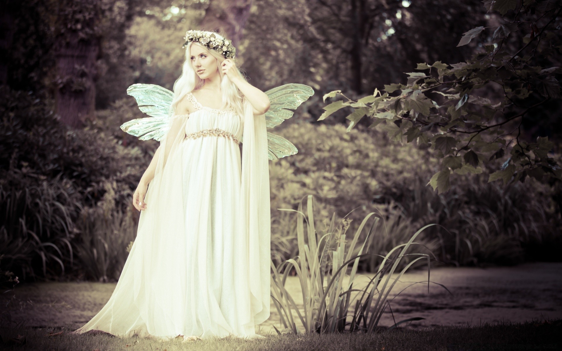Kanatlı bir gelinlik giymiş bir kızın vintage görüntüsü