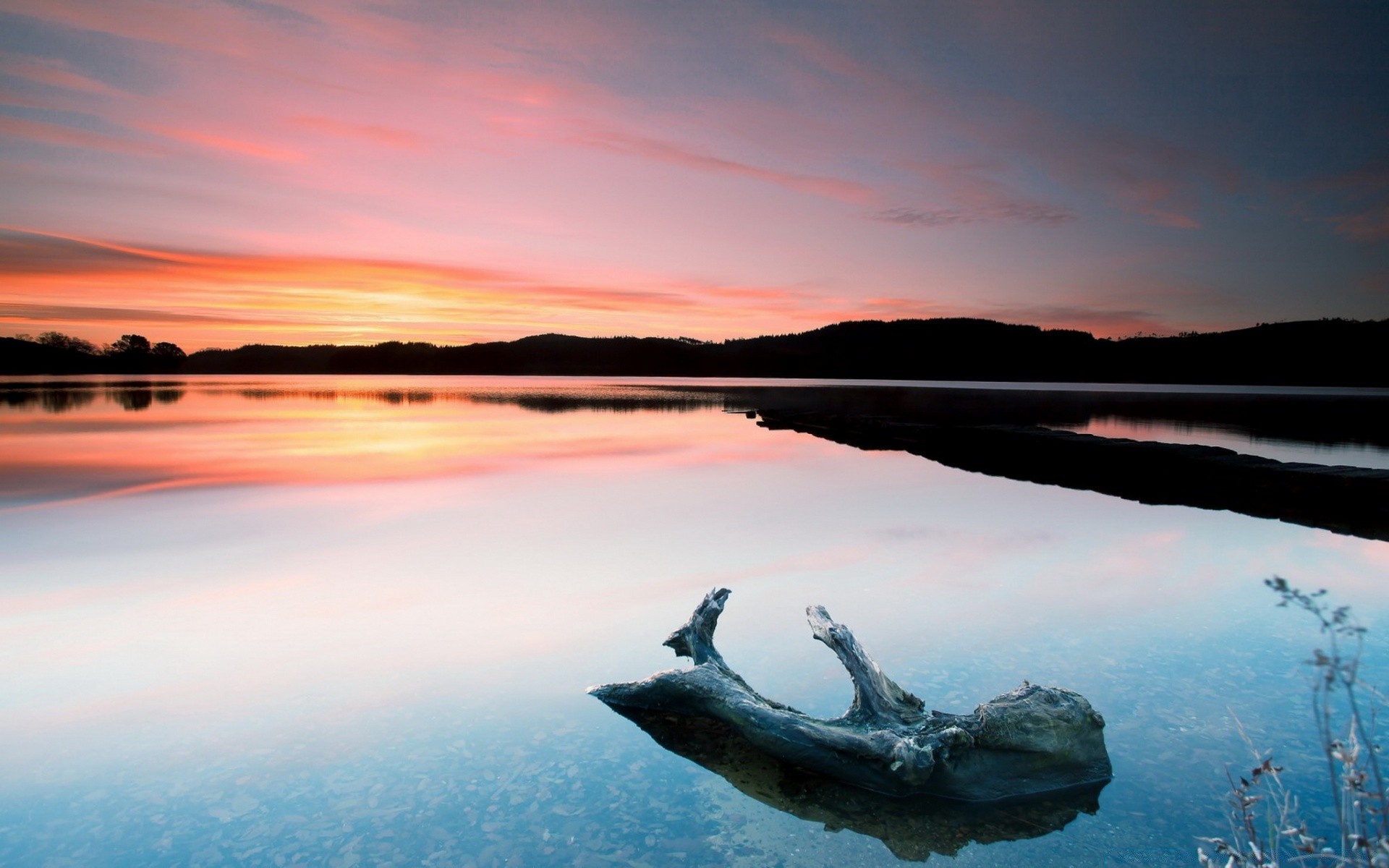 Temiz gölün ortasında dalgaların karaya attığı odun