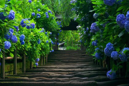Mavi çiçekli çalılar çemberindeki merdivenler