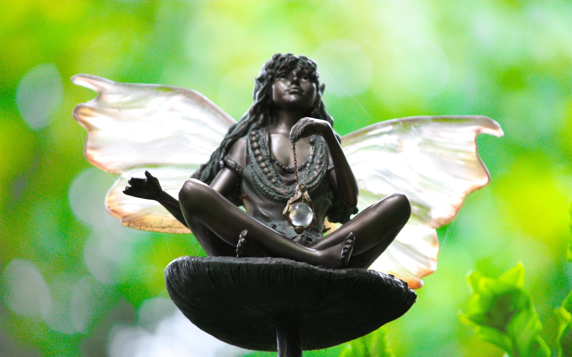 Yeşil bir arka plan üzerinde oturan bir kızın heykeli