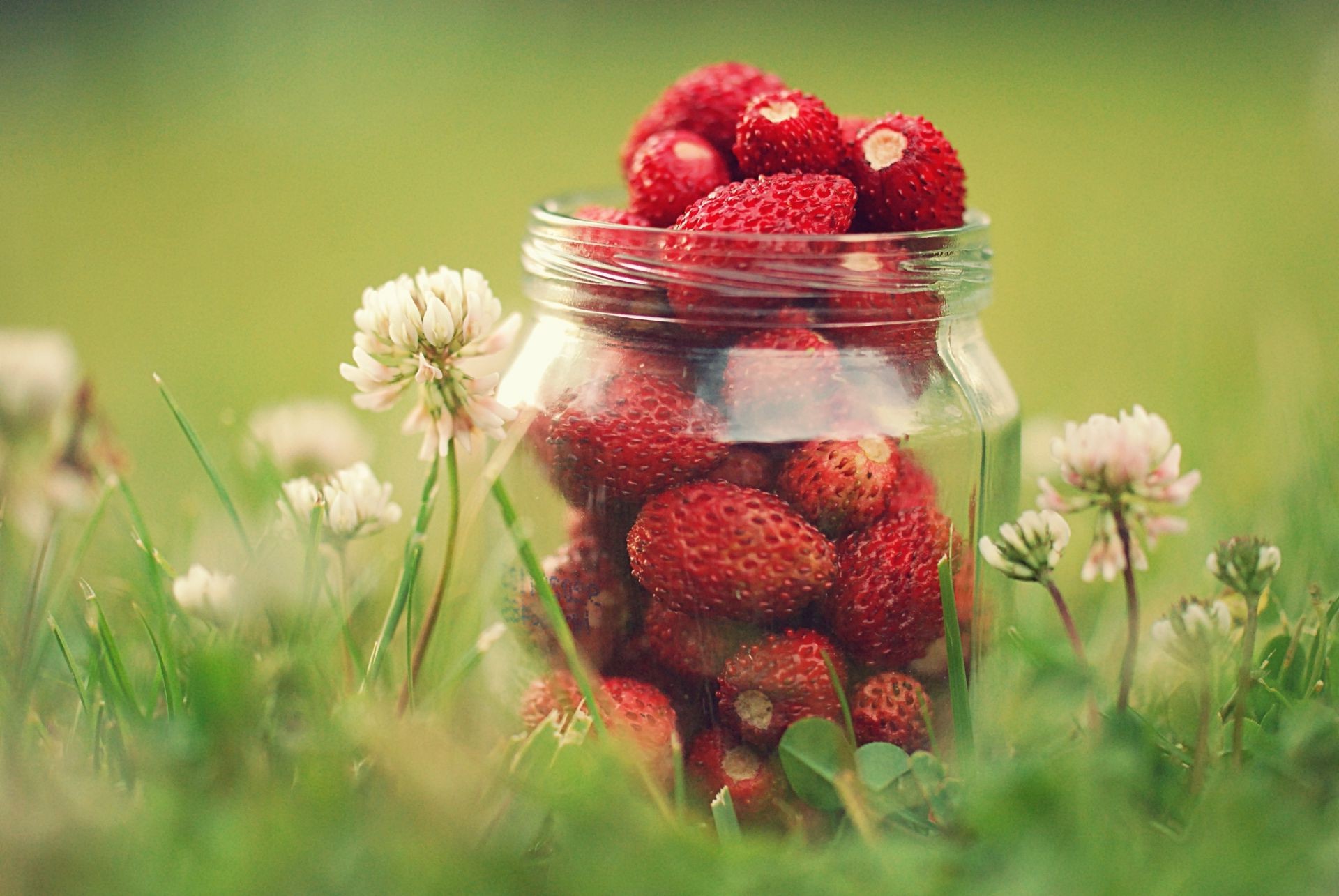 Çimlerin üzerinde bir kavanoz olgun çilek