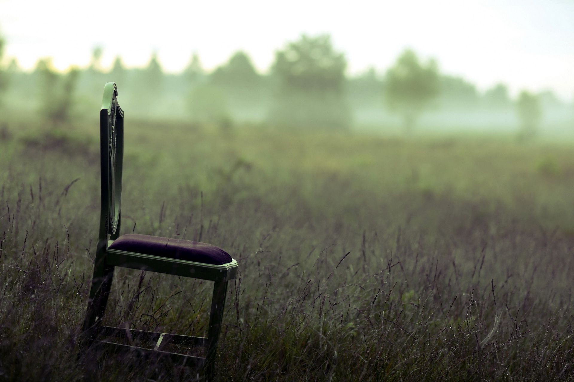 Sandalye tarla ve ağaçların arka planına karşı duruyor