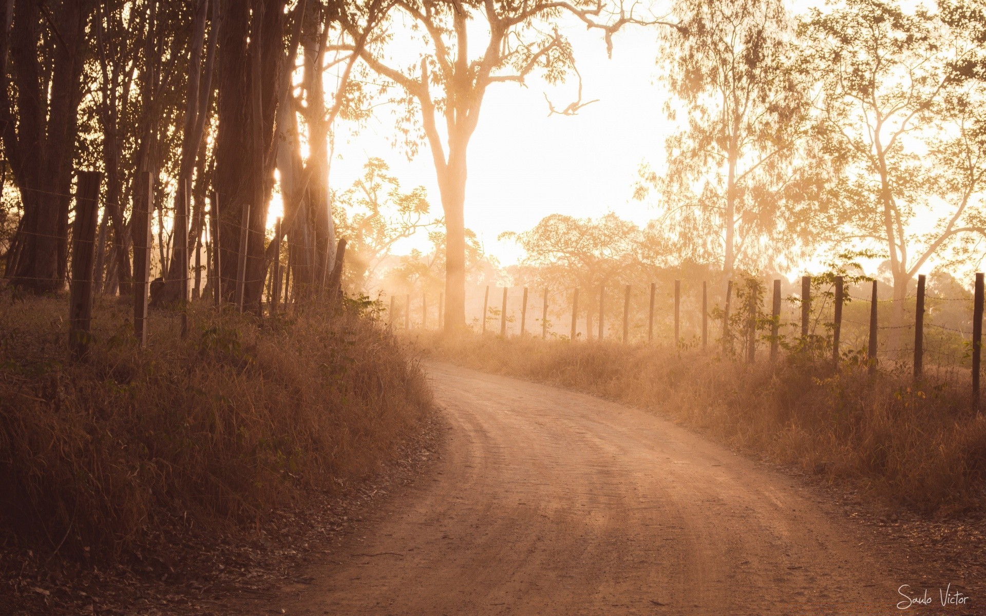 Sisli bir kırsal yol. Yumuşak güneş. Tozlu yol