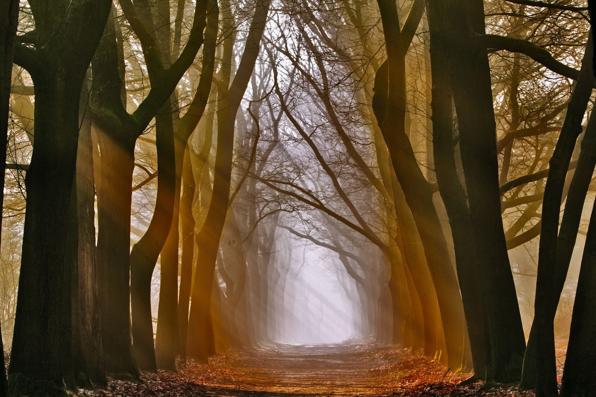 Sonbahar ormanındaki asırlık ağaçların arasındaki yol