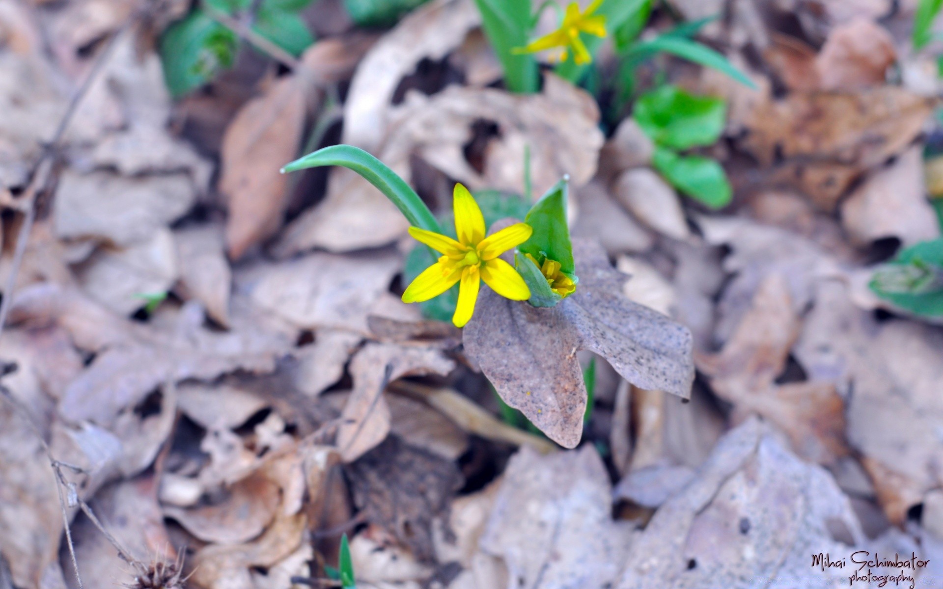 Kuru yapraklarda sarı çiçek
