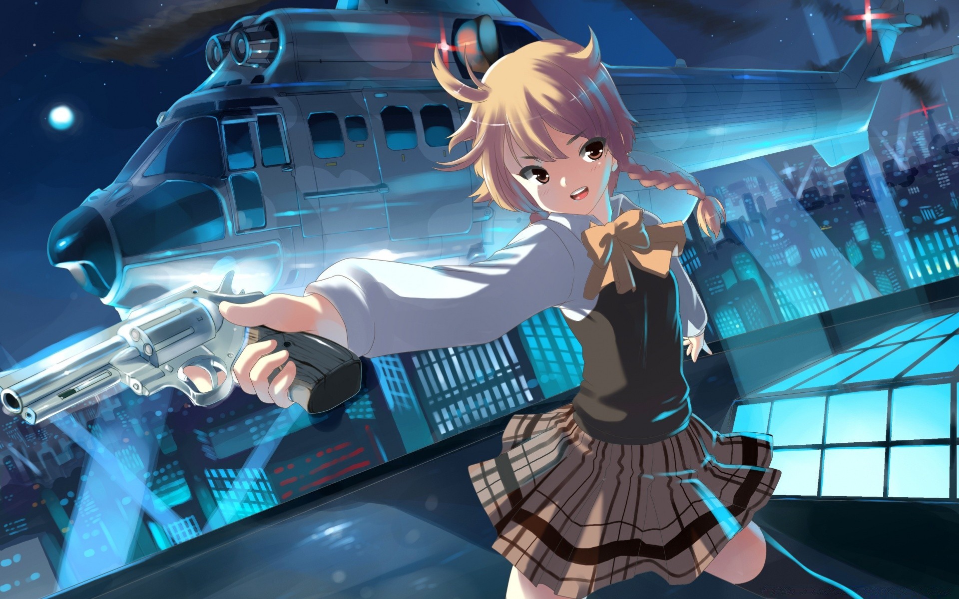 Anime çizimi. Elinde yeşil saçlı ve silahı olan kadın