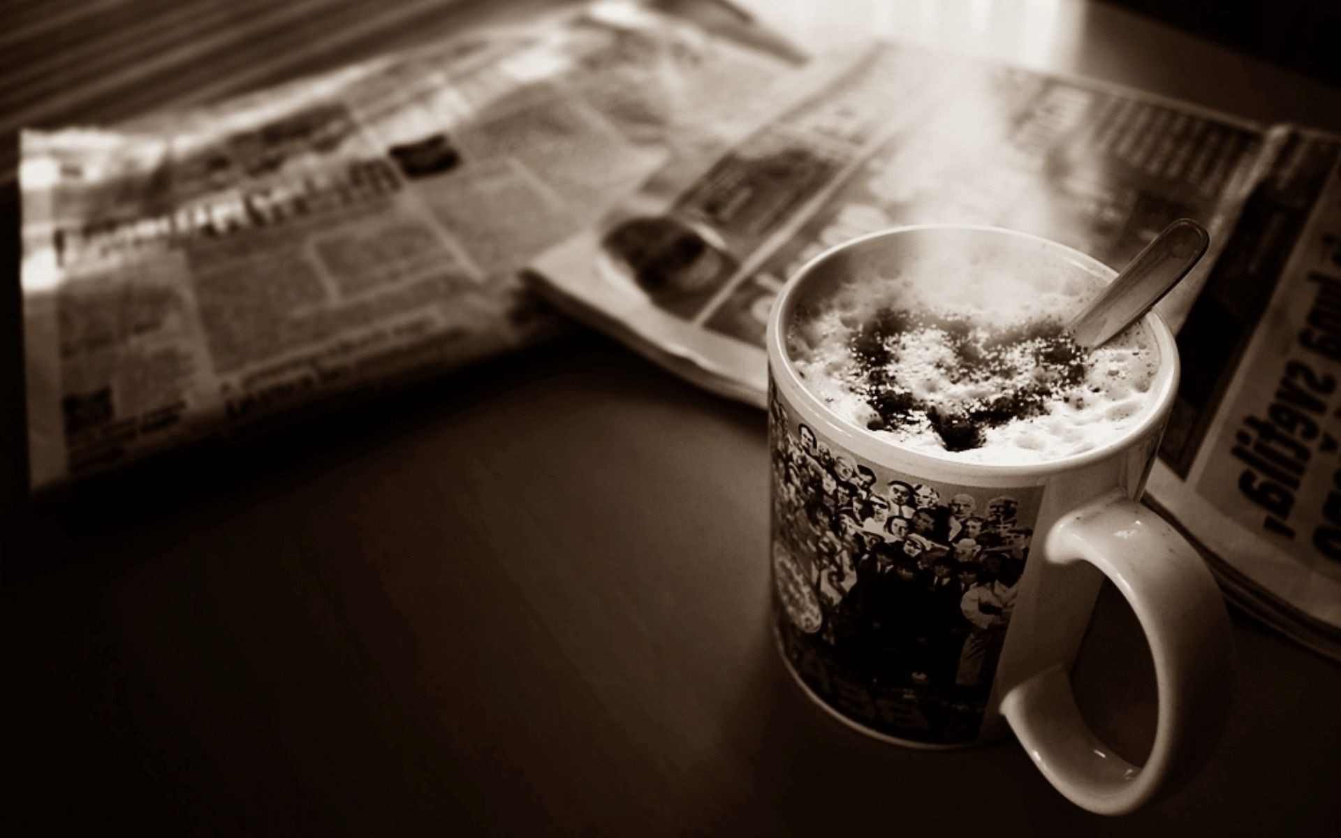 Kahve fincanı Köpüklü kalp gazetesi masası fotoğraf sepya