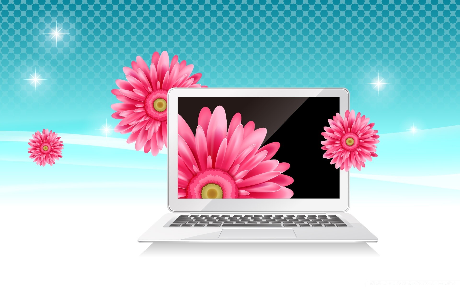 Pembe gerberalarla mavi bir arka plan üzerinde dizüstü bilgisayar
