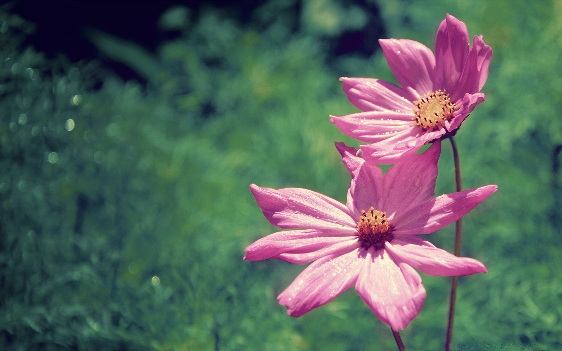 Bulanık yeşil bir arka plan üzerinde iki pembe çiçek