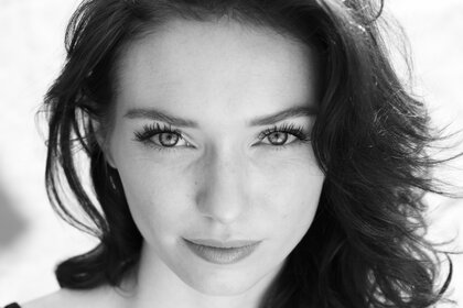 Siyah beyaz bir arka plan üzerinde uzun kirpikli kız