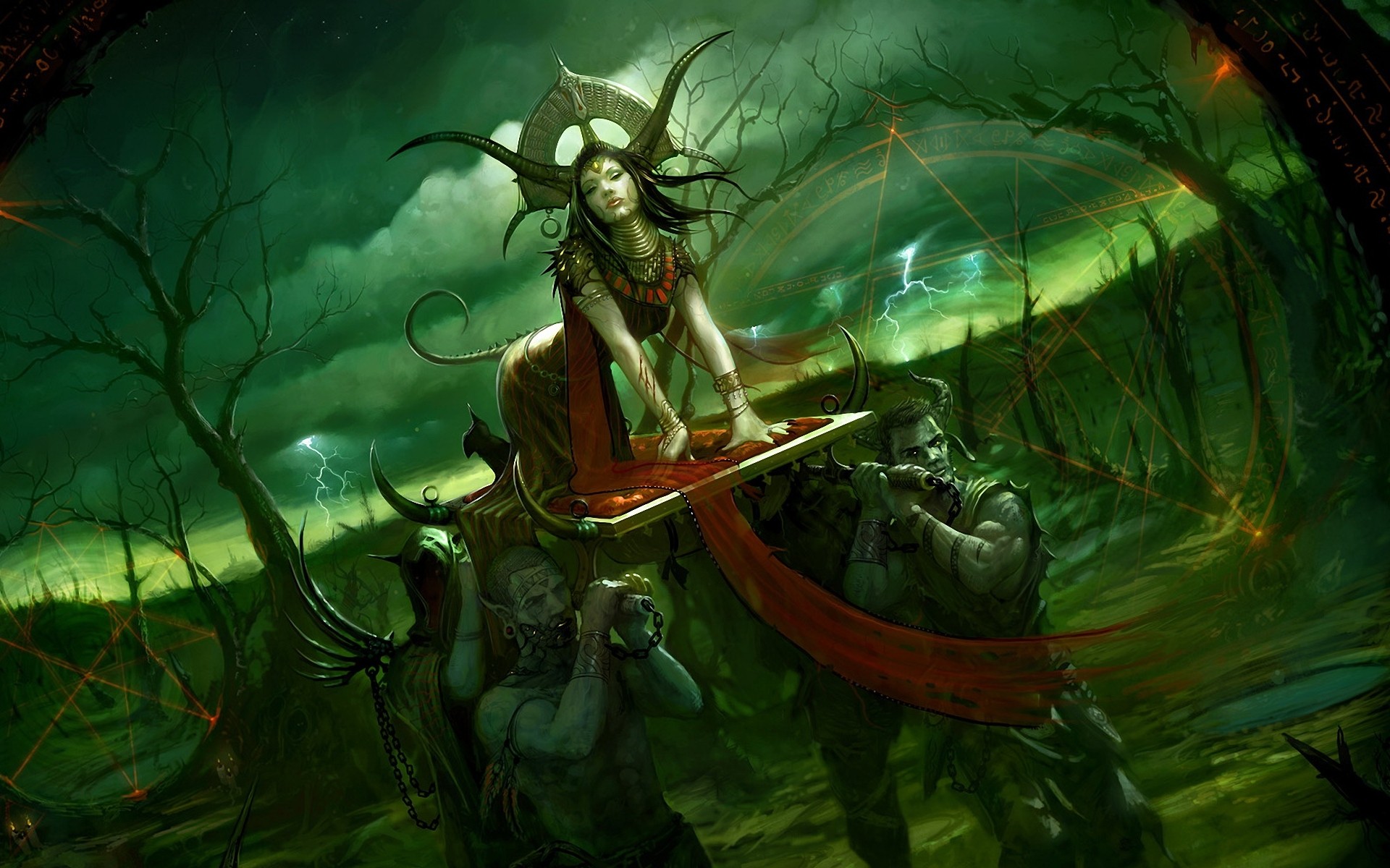 Yeşil bir arka plan üzerinde fantezi karakterler