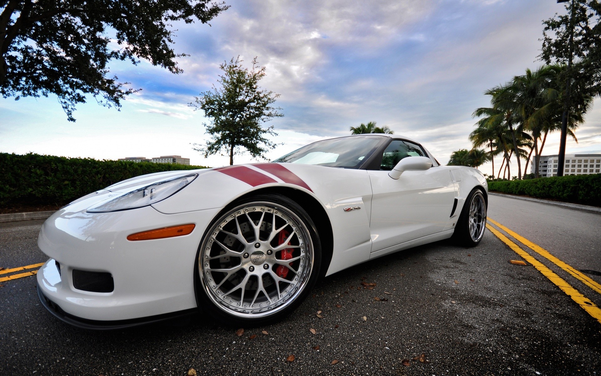 Palmiye ağaçlarının ortasında gün batımında spor kırmızı araba