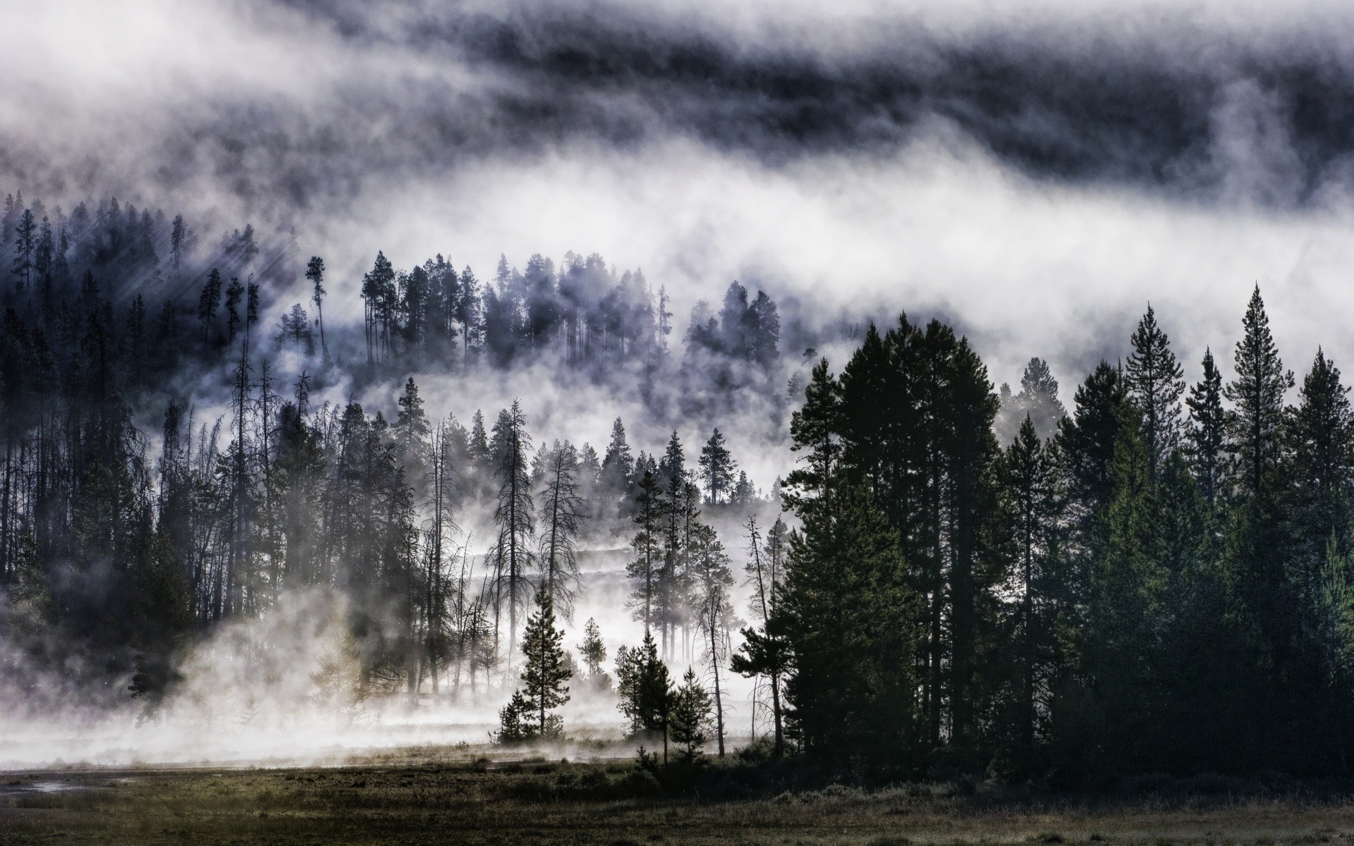 Çam ormanı ve sisli alan