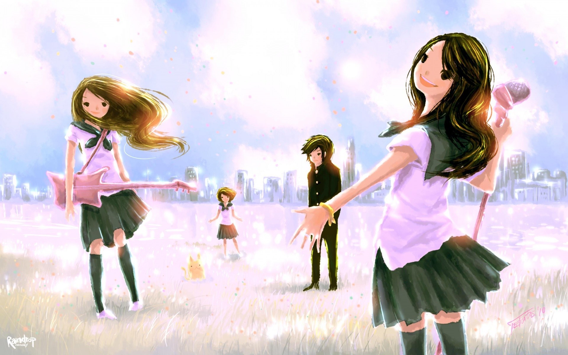 Müzik grubu. Gençler ve kızlar prova yapıyorlar. Anime