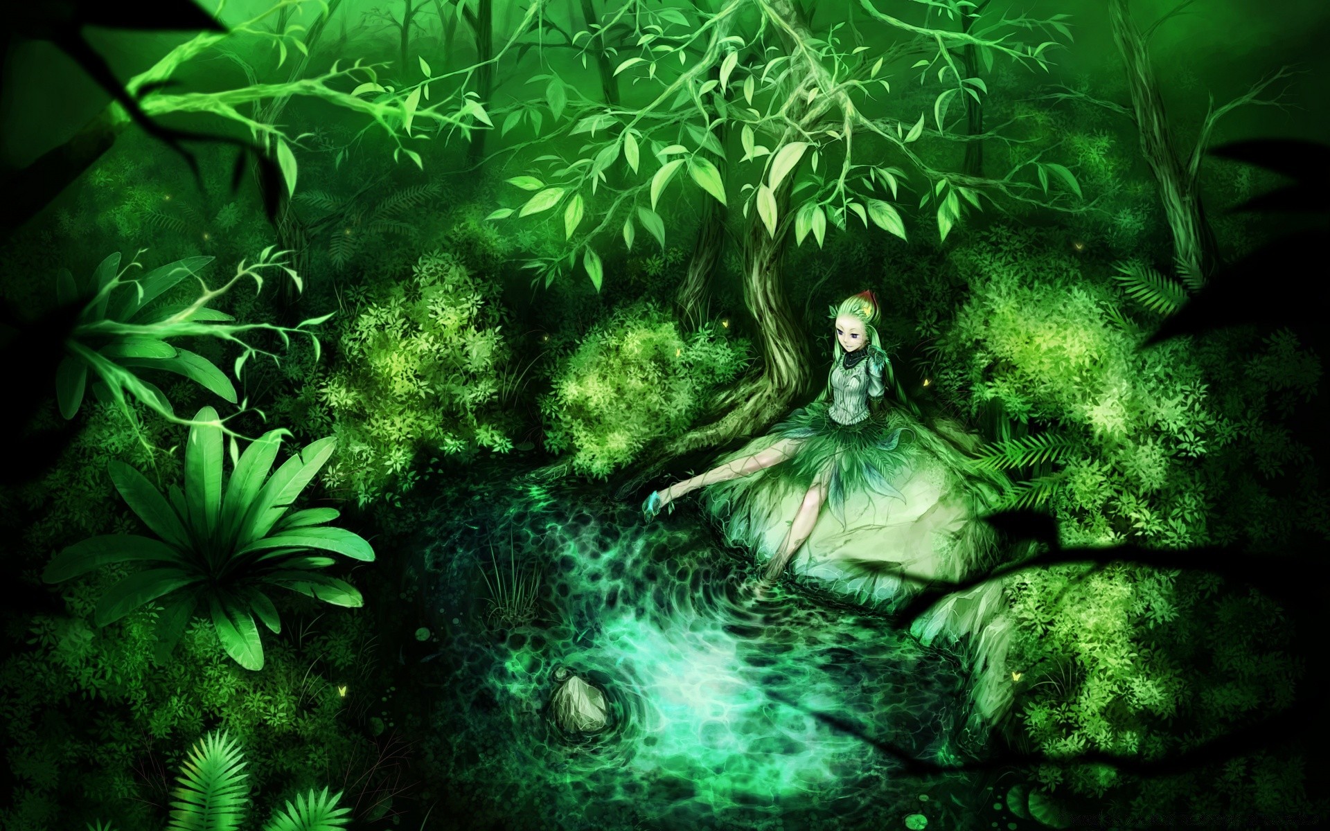 Anime kızları ormanda yürüyorlar. Cadı, periler. Ağaçların arasında güneş ışınları