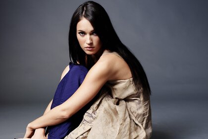 Uzun saçlı esmer kameraya etkileyici bir şekilde bakıyor
