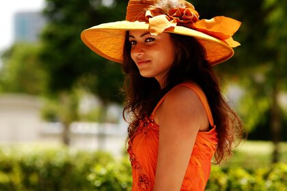 Kırmızı elbiseli ve şapkalı bir kızın portresi