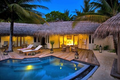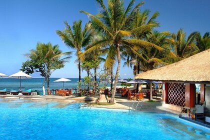 Palmiye ağaçlarının bulunduğu otelde yüzme havuzu
