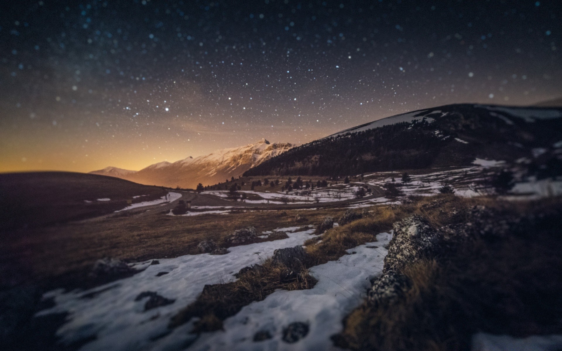 Kışın dağların üzerinde yıldızlı gece gökyüzü