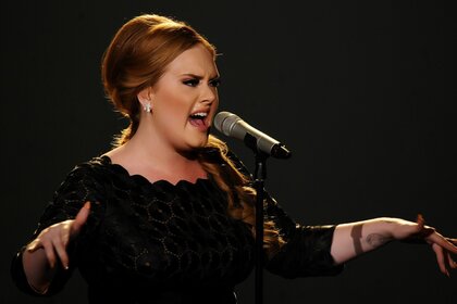 Gece elbiseli şarkıcı mikrofona şarkı söylüyor