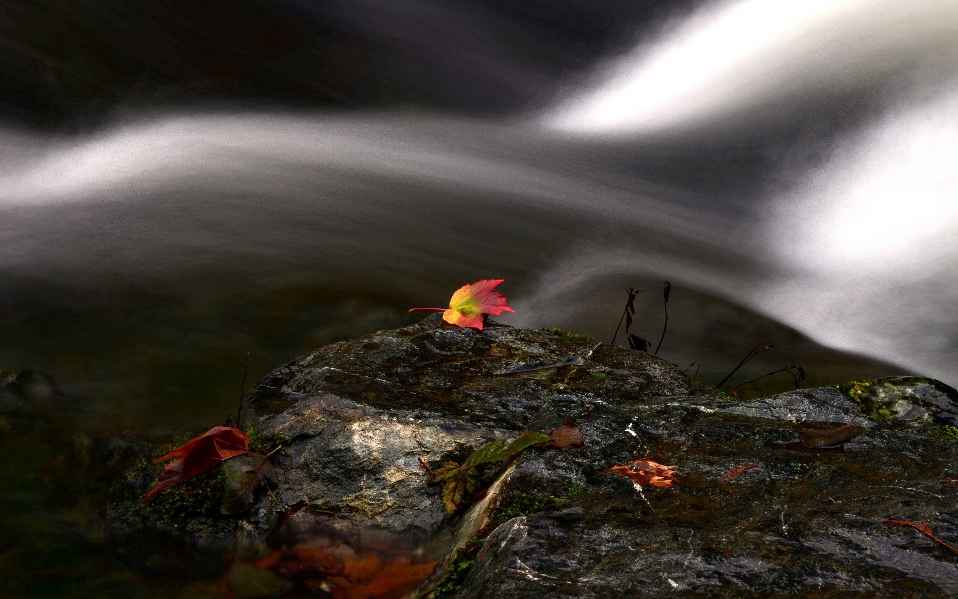 Sonbahar manzarası. Nehrin berrak suları düşmüş bir yaprağı taşır