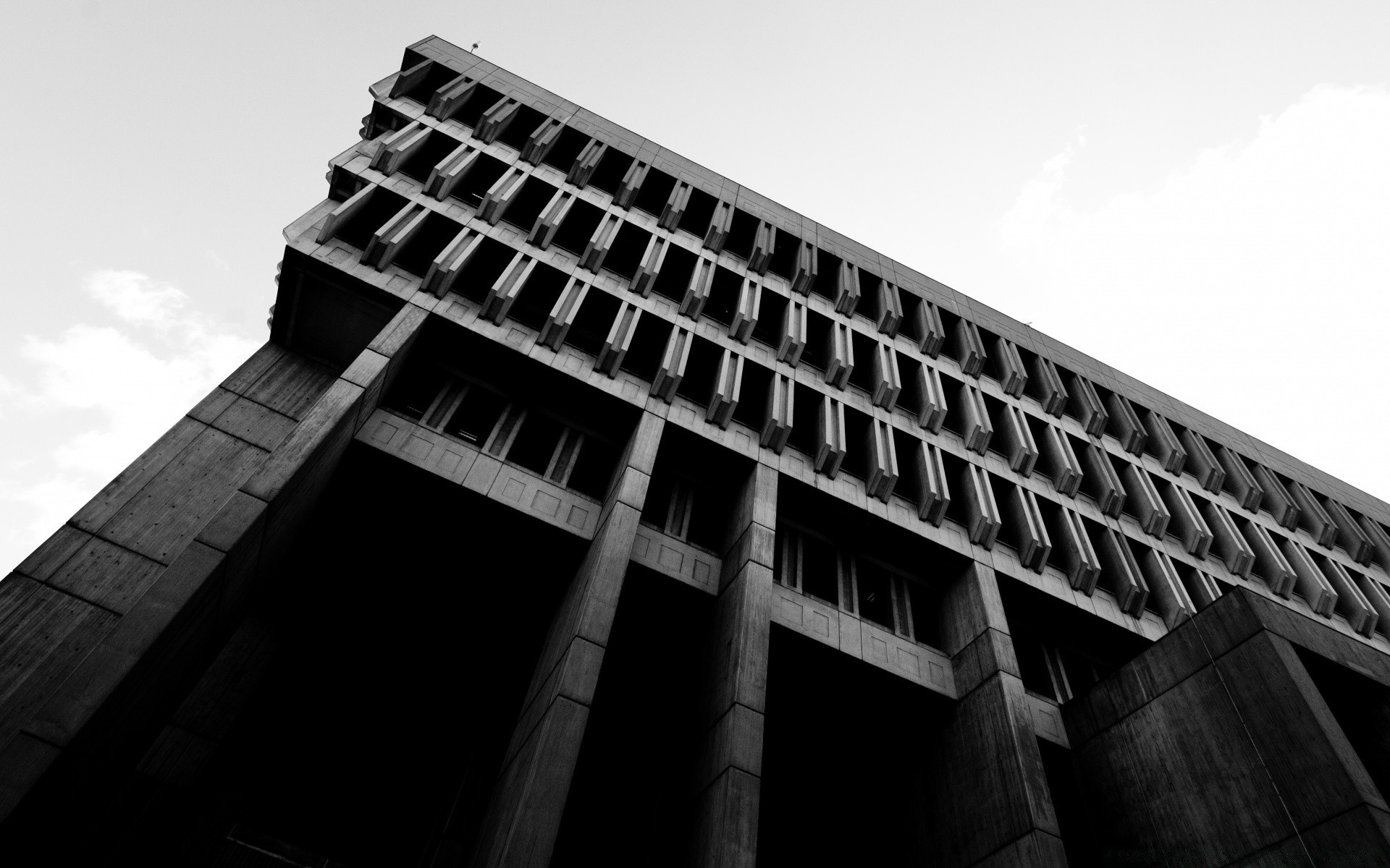 Gökyüzünün arka planına karşı binanın siyah ve beyaz fotoğrafı