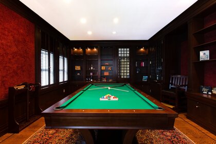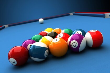 Bilardo oyuncusu topu cebine atmaya hazırlanıyor