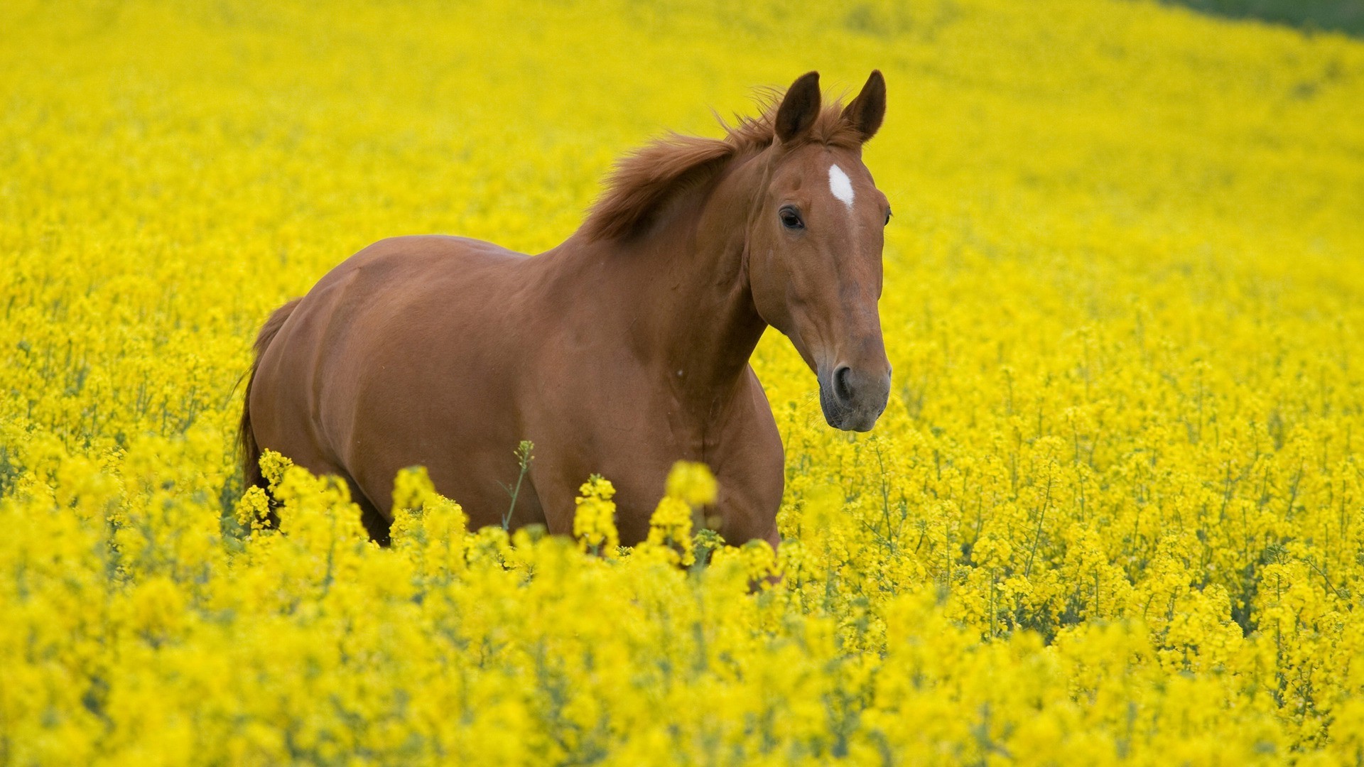 Sarı çiçek tarlasındaki genç aygır