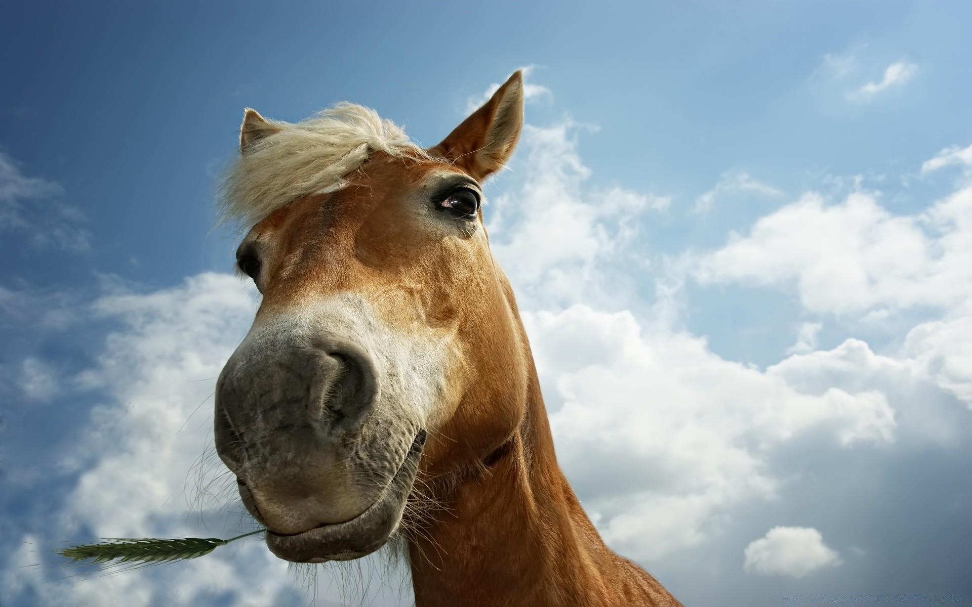 Beyaz toynaklı bir at. Mavi güzel gökyüzü
