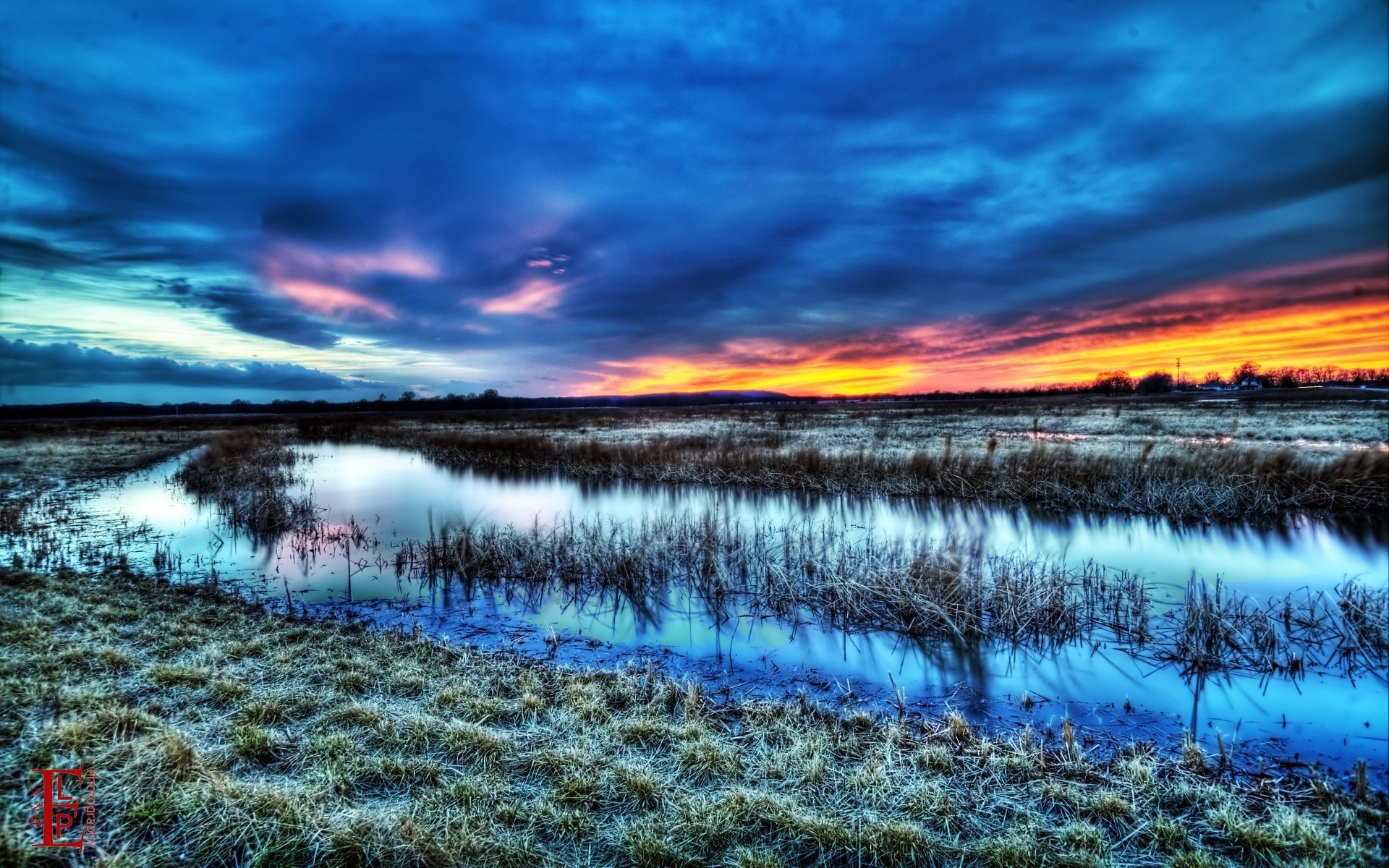 Çimenlerin ve suyun arka planında renkli bulutlar