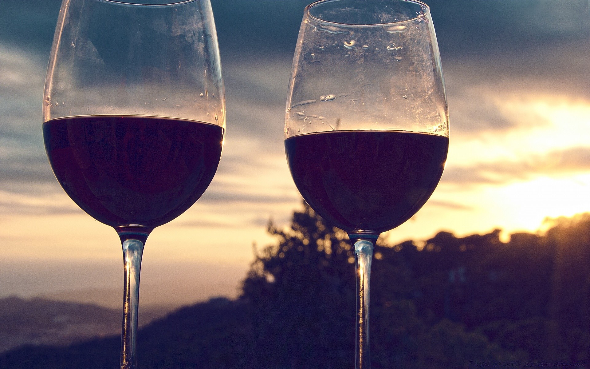 Bulutlu gökyüzüne karşı iki bardak şarap