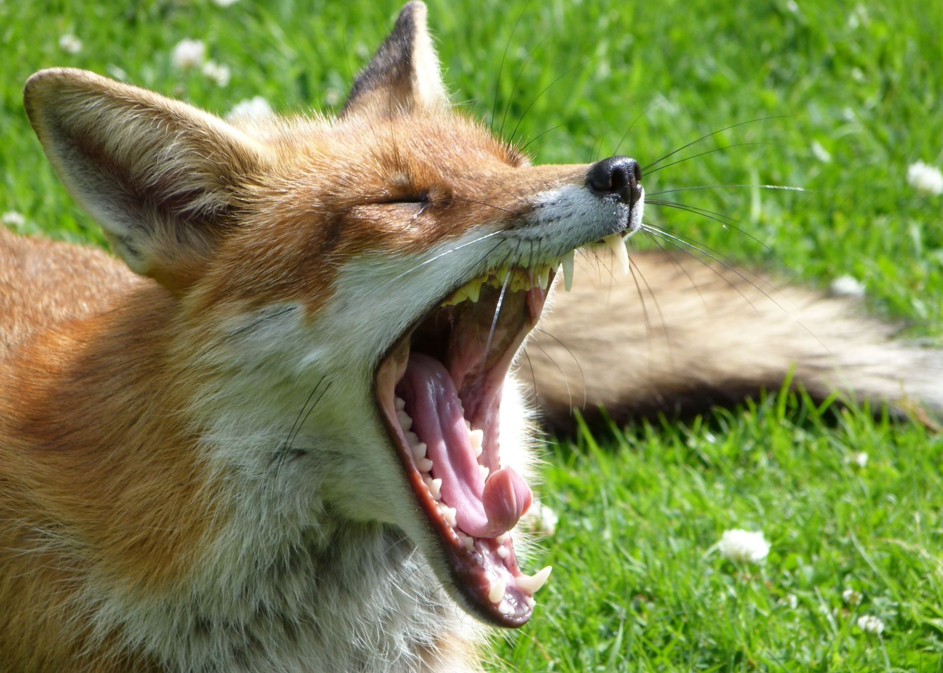 Tilki çimenlerin üzerinde uzanırken esniyor