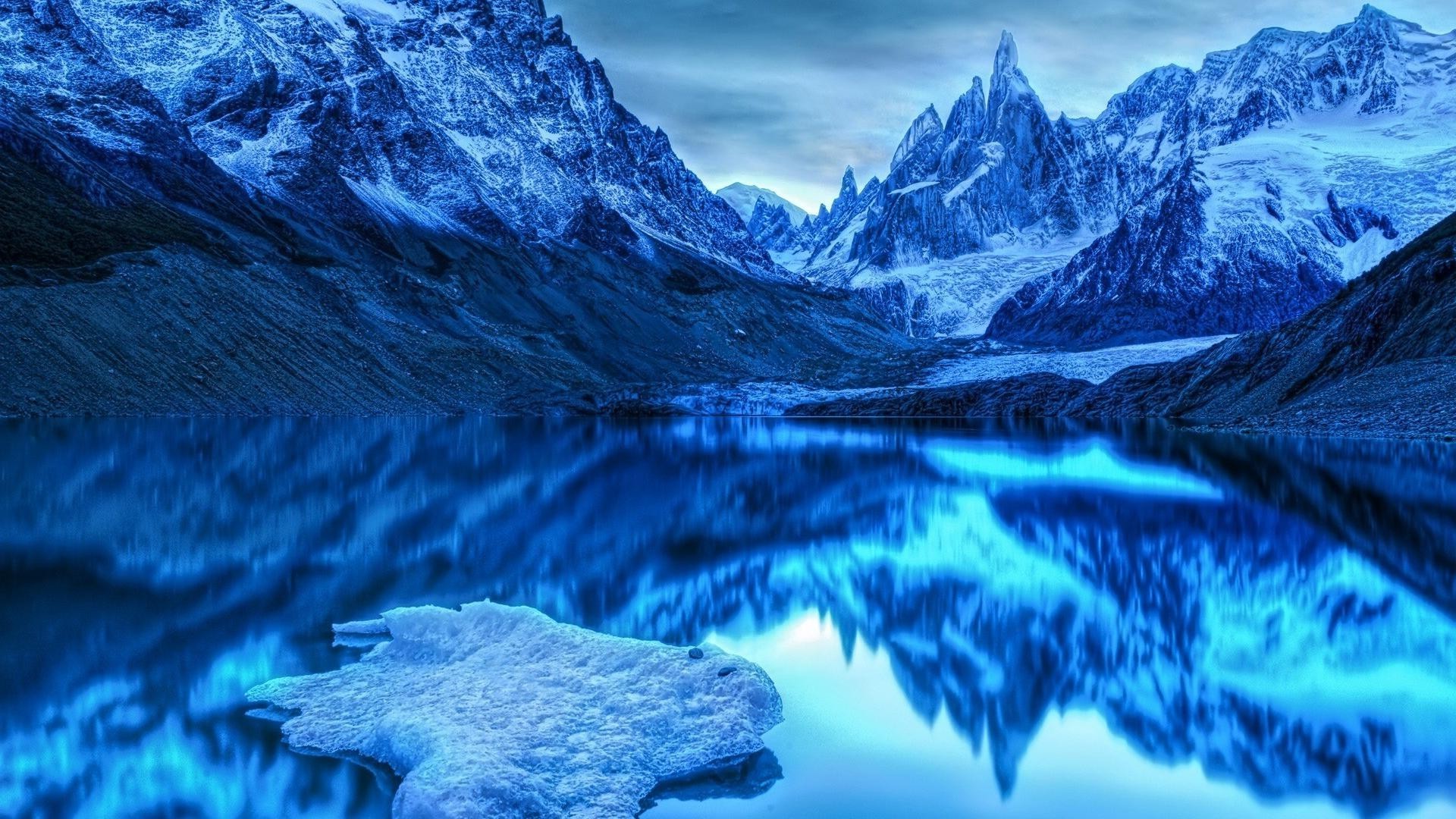 Mavi gökyüzüne karşı karla kaplı dağlar