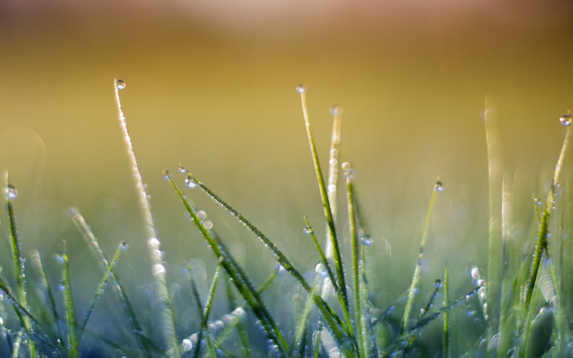 Sabahın erken saatlerinde çimlerin üzerinde çiy ile