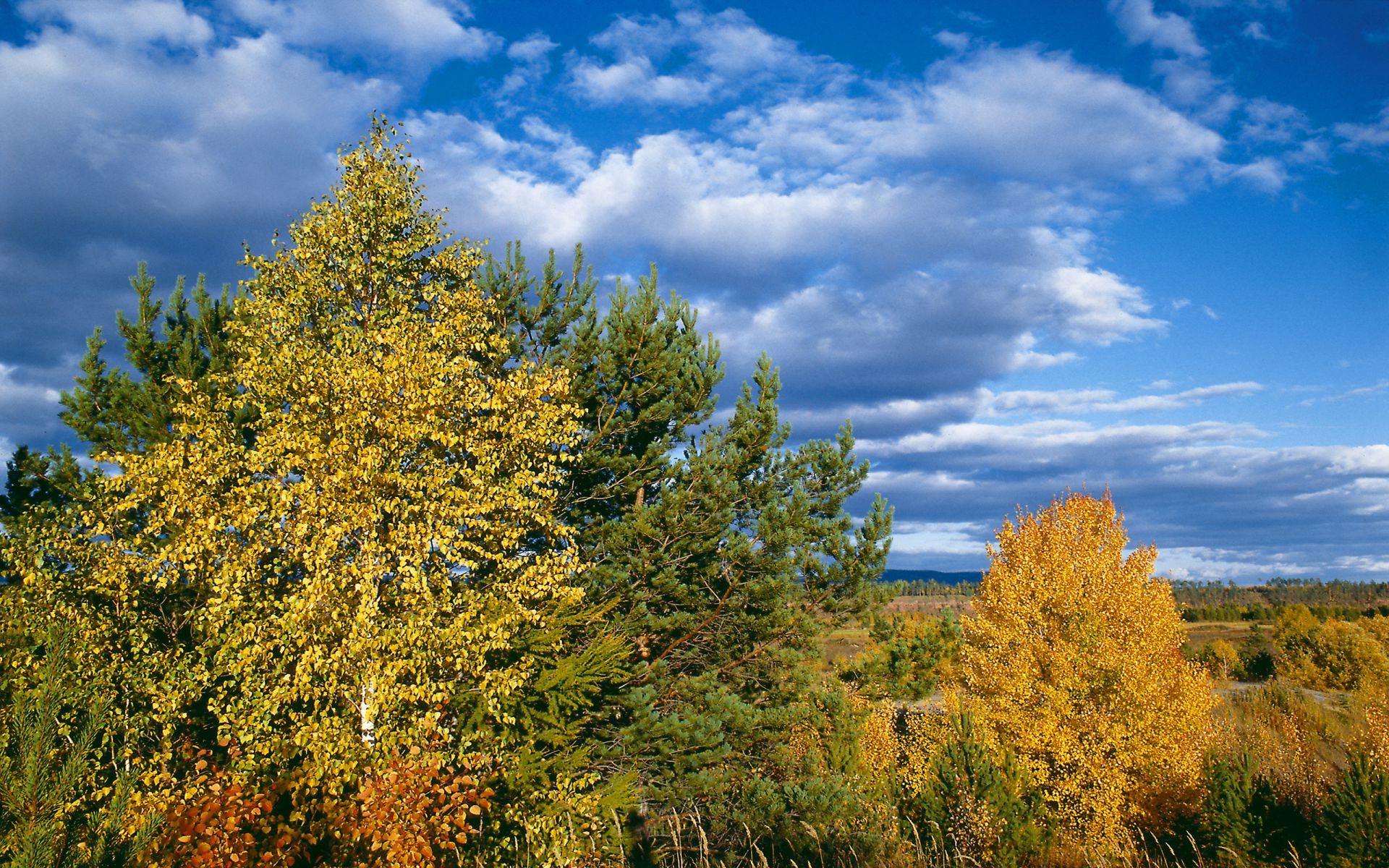 Sonbaharın çeşitli tonları. bulutlar ile güzel gökyüzünün arka planında ağaçlar
