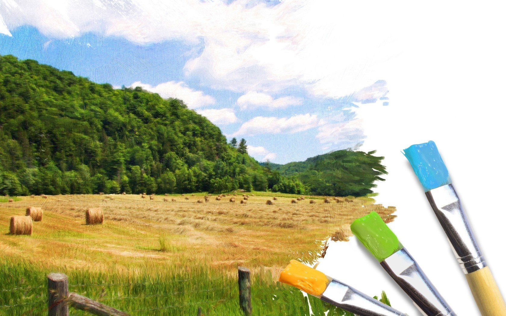 Orman ve saman yığınları ile boyalı manzara