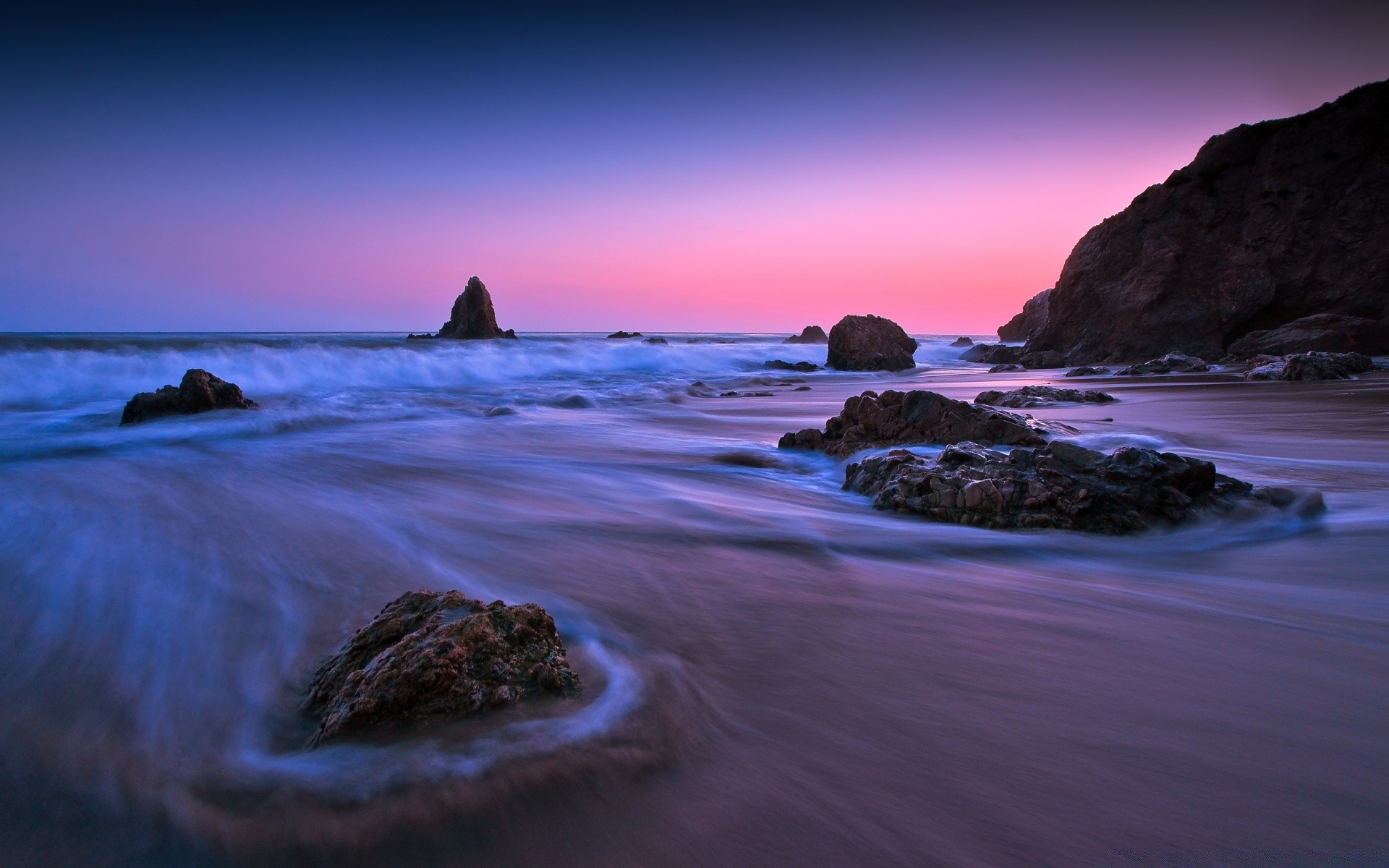 Soğuk bir deniz şafağı kıyıdaki devasa kayaları aydınlatıyor