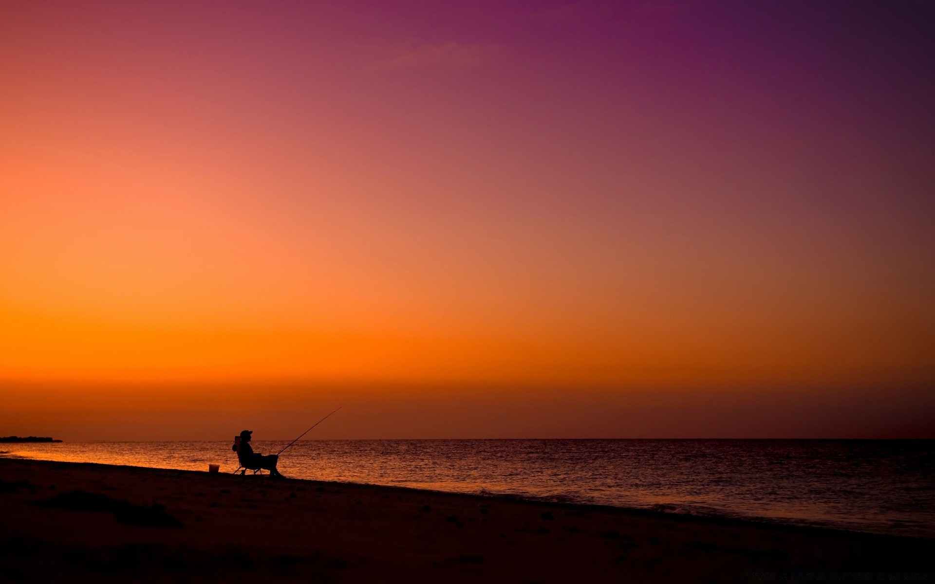 Deniz kıyısı ve gün batımı. Kıyıdaki adam