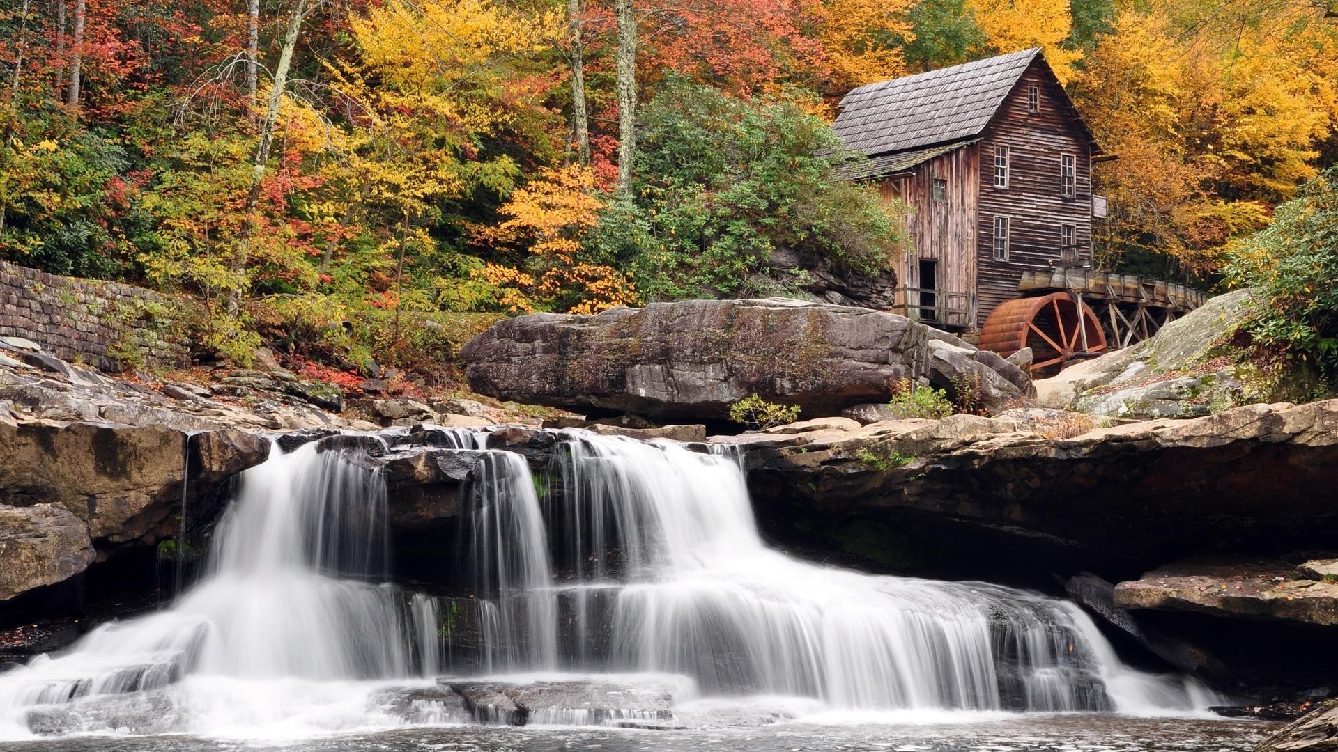 Şelalenin kenarında bir ev bulunan sonbahar ormanıŞelalenin kenarında bir ev bulunan sonbahar ormanı