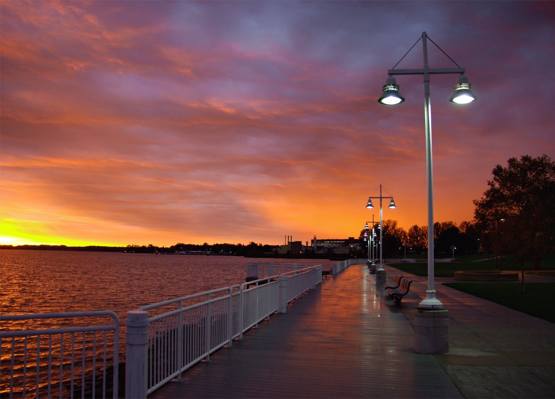 Şafakta yağmurdan sonra fenerlerle dolu iskele