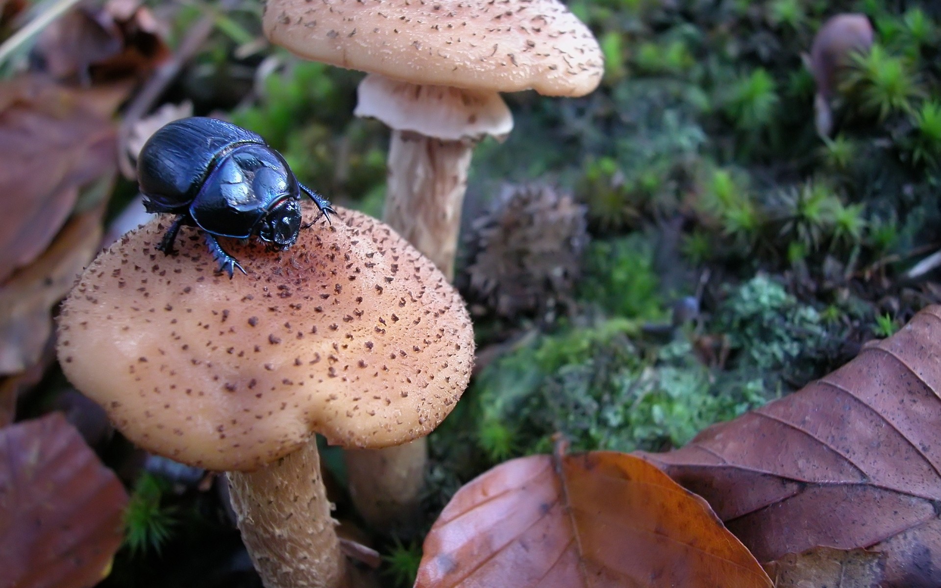 Yosun kaplı uzanmış bir ağaçta büyüyen mantarlar